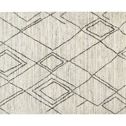 This "Austin" rug from At Home will look great under the dining table. It's not white so will hide any stains and food crumbs. I think the main color will look good with the chairs you have. And the black accents will tie in with the black kitchen pulls and dark chandelier above the table. 6 in stock in Pflugerville store.